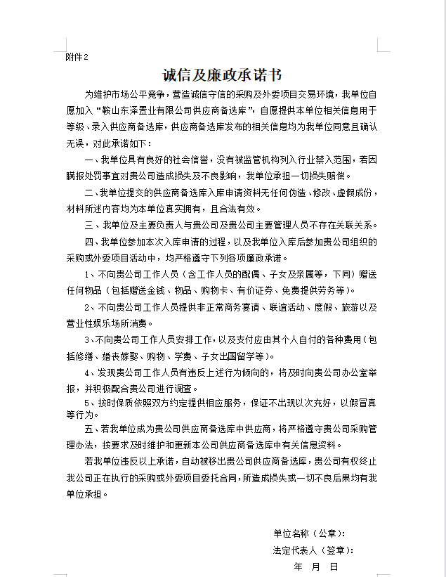 1.請有意向的企業(yè)按要求填寫《供應商入庫登記備案信息表》(見附件1)和《供應商誠信承諾書》(見附件2)。請將填寫完畢并加蓋公章的上述資料掃描件,以及營業(yè)執(zhí)照的掃描件,發(fā)送至指定郵箱asdc2017@163.com。同時,企業(yè)也可選擇將蓋章的紙質(zhì)版資料和營業(yè)執(zhí)照復印件(同樣需加蓋公章)送至鞍山市鐵東區(qū)建國大道21號206辦公室。如有任何疑問或需要協(xié)助,請撥打聯(lián)系電話:15141215535。