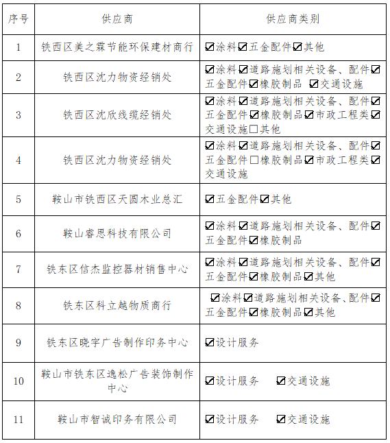 根據(jù)2024年5月11日發(fā)布的《供應(yīng)商入庫公告》要求,經(jīng)過報(bào)名篩選和資質(zhì)審查等程序,確定了11家供應(yīng)商符合入庫條件?,F(xiàn)公布經(jīng)過篩選的供應(yīng)商入庫清單,名單如下: